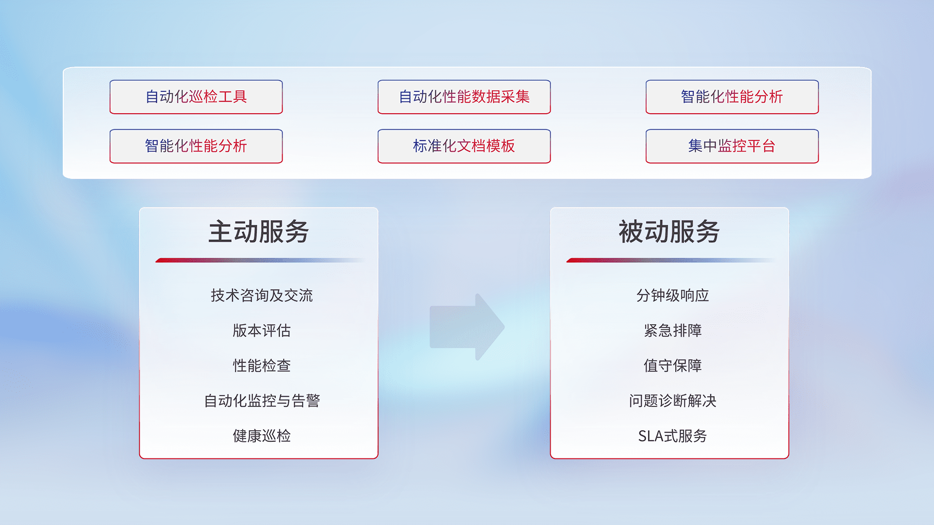 智能化工具和标准化文档,,保障服务质量,,,提供主动服务(包含技术咨询、、、版本评估、、性能检查、、、自动化监控与告警、、、、健康巡检)和被动服务包含(分钟级响应、、、紧急排障、、值守保障、、问题诊断解决、、SLA服务)。。